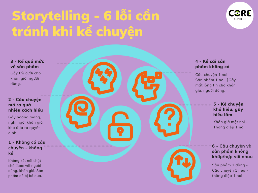 6 lỗi: không có câu chuyện, mở ra nhiều cách hiểu, kể quá lên, kể cái sản phẩm không có, kể chuyện khó hiểu, câu chuyện và sản phẩm không phù hợp.